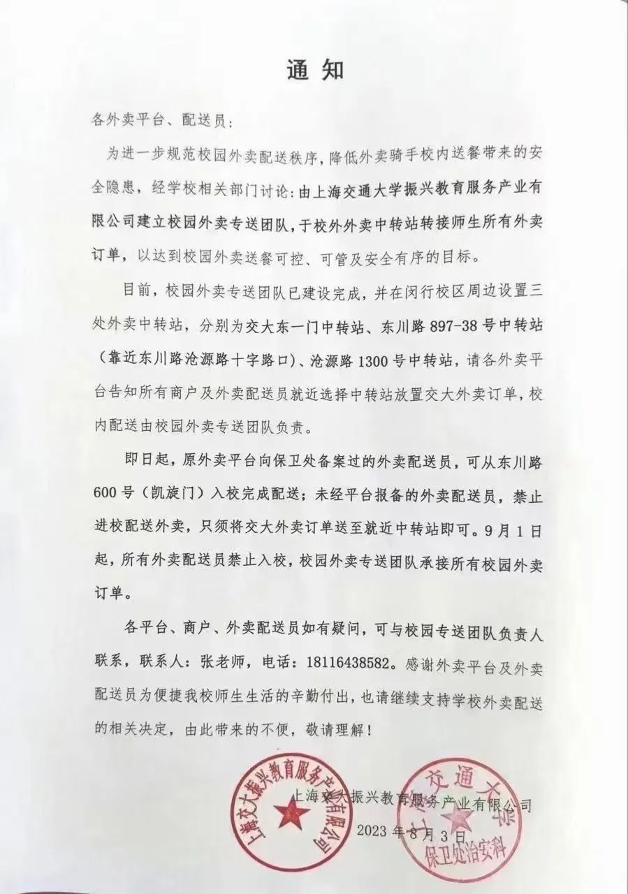 日当,海交大校内学生获悉彭湃信息记者从上,3日前后8月1,平台、配送员的一张写给各表卖,科公章的知照正在该校内部撒布盖有上海交通大学防守处治安。
