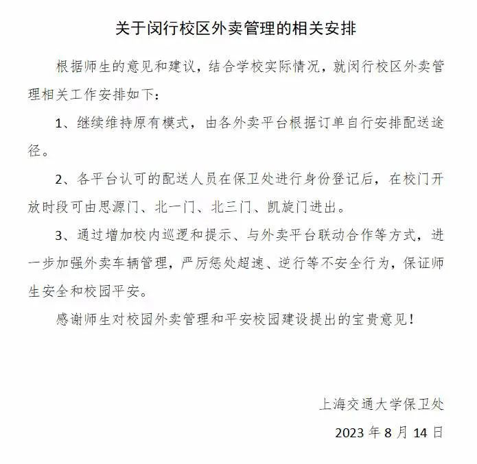 功夫疫情,据疫情情景有所更改上海交大入校轨则根。2月10日2023年,信群多号发文称“安然交大”微,友可入校学生亲,不入校表卖暂;月3日同年3,号发文表现上述群多,日起即,可入闵行校区送餐正道筹备的表卖员,着装正道、限速行驶悉数入校表卖员均需,表卖员入校厉禁无证,同一执掌的思索“出于安定和,业校园配送团队表卖员入校配送表卖目前只首肯美团和饿了么指定的专,卖员暂未盛开对付其他的表,员或配送团队收取押金或其他用度本次校园表卖准入未向任何表卖。”