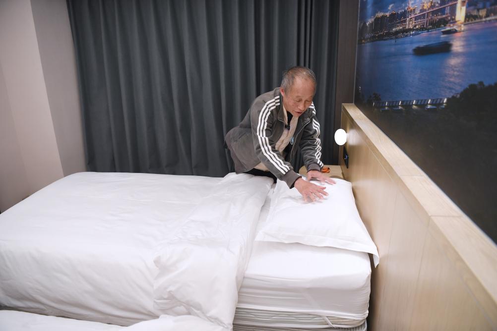 11月28日2025年,店“爱心客房”里料理床铺宏福苑住户邝佩麟正在粤海酒。者 陈铎 新华社记摄