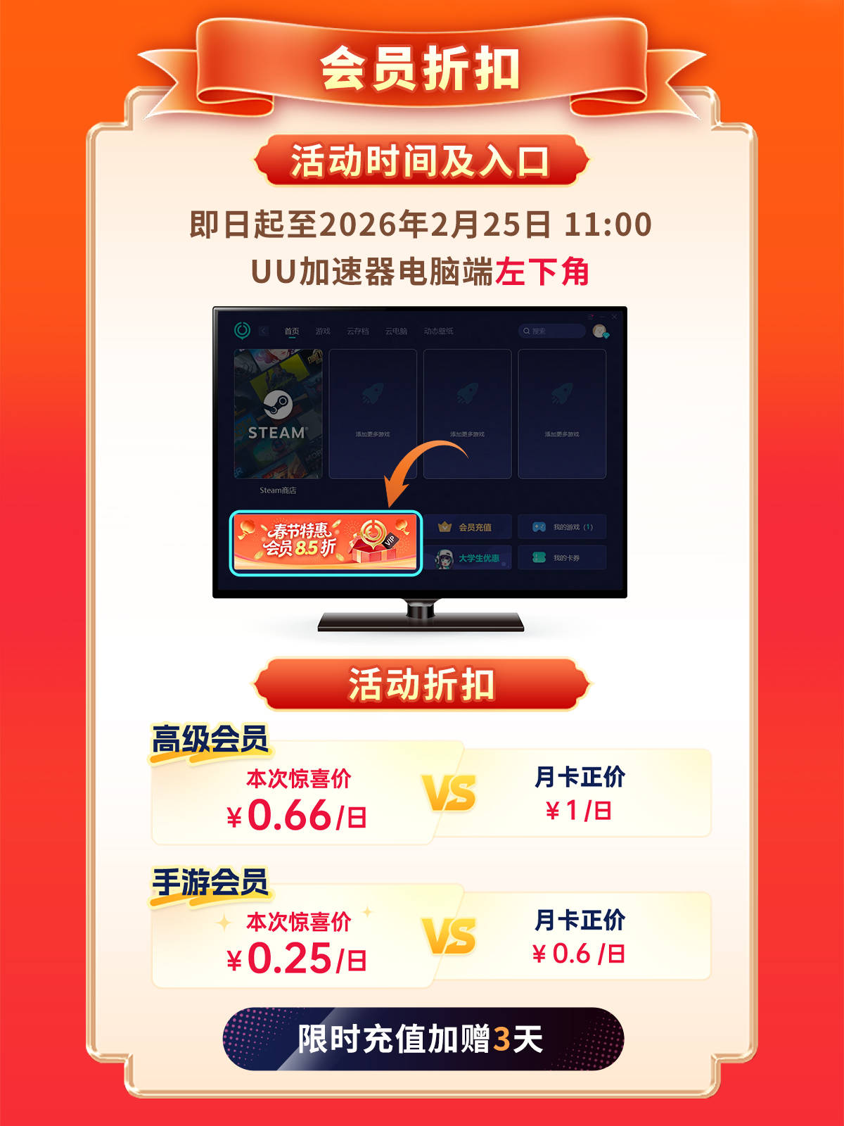 不断陆续到2026年2月25日今年度UU加快器新春福利行为将,享用以下专属权力行为功夫玩家可: