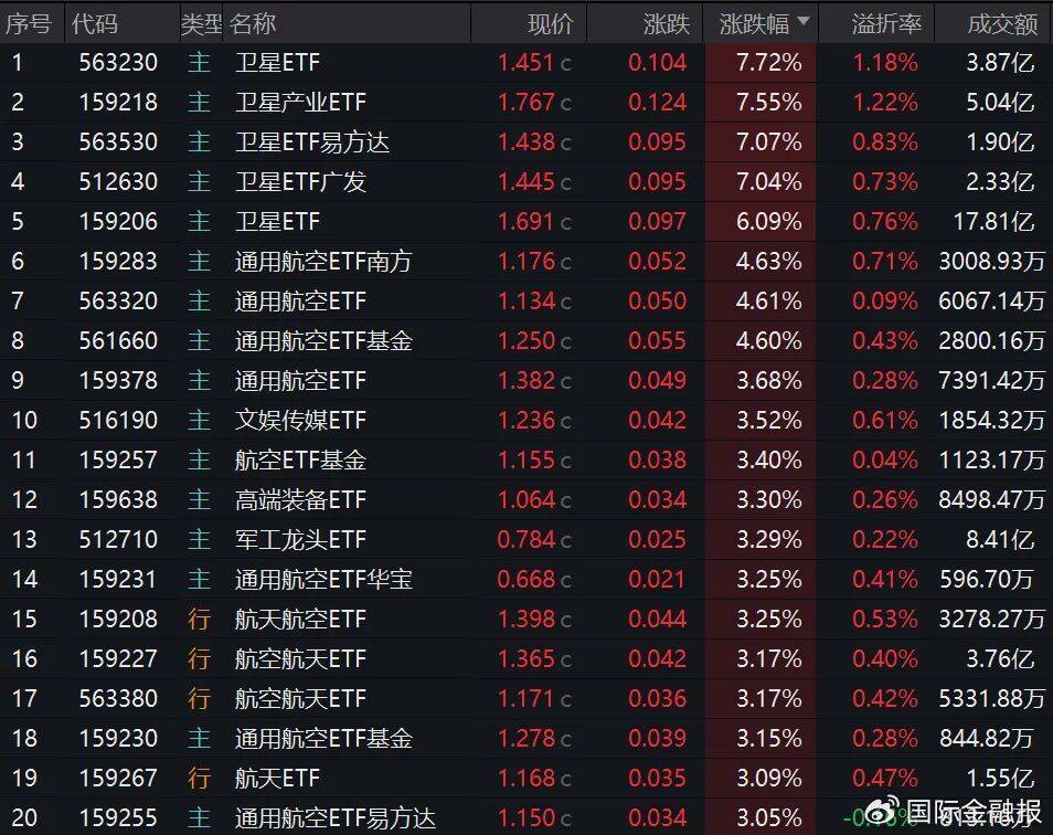 TF:航天、卫星多股涨停板块飙升直接点燃个股与E,ETF飙逾7%4只卫星主旨,全墟市领涨;等合连ETF亦团体高位跟涨通用航空、航天航空、军工yaxin111.net